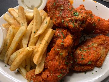 LIGHTLY BATTERED TOSSED IN YOUR CHOICE OF BUFFALO OR BBQ