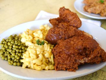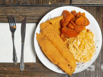 SERVED WITH BAKED MAC AND CHEESE, PEAS OR CORN. AND A ROLL