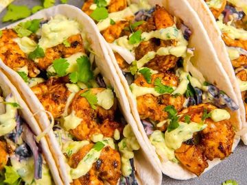 BLACKENED FISH, CHICKEN, OR SHRIMP, OR JACKFRUIT, CILANTRO LIME SLAW, SOULE SAUCE, WHITE CORN TORTILLAS