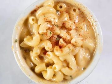 CREAMY MAC AND CHEESE LOADED WITH LA CRAWFISH TAILS, SHRIMP, AND LUMP CRAB