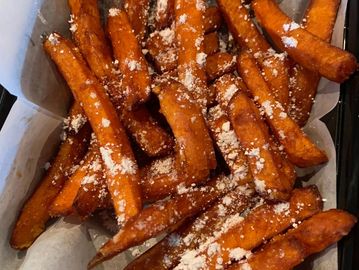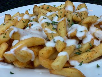 BATTERED AND FRIES OYSTER MUSHROOMS SERVED WITH FRIES, SAUCES (BBQ, SWEET CHILLI, GARLIC PARMESAN, BUFFALO, JERK, AND ASSASSIN)