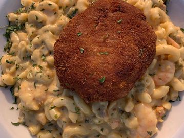 CREAMY MAC N CHEESE TOSSED IN CRAWFISH TAILS, SHRIMP AND LUMP CRAB MEAT
