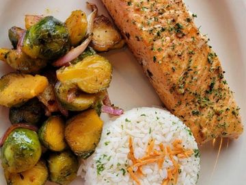FILET OF SALMON GRILLED AND SERVED WITH RICE AND VEGGIES