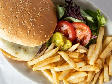ANGUS BEEF, TURKEY OR IMPOSSIBLE GRILLED AND DRESSED WITH LETTUCE, TOMATO, PICKLES, AND ONION WITH FRIES