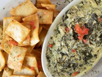 SPINACH AND ARTICHOKES IN CREOLE STYLE CREAMY 3 CHEESE BLEND SERVED WITH HOUSE MADE CHIPS