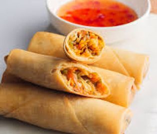 WRAPPED ROLLS OF CABBAGE, CILANTRO, CARROTS, SERVED WITH SWEET CHILLI SAUCE